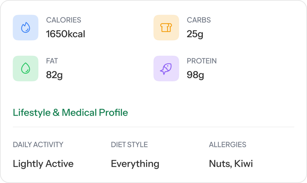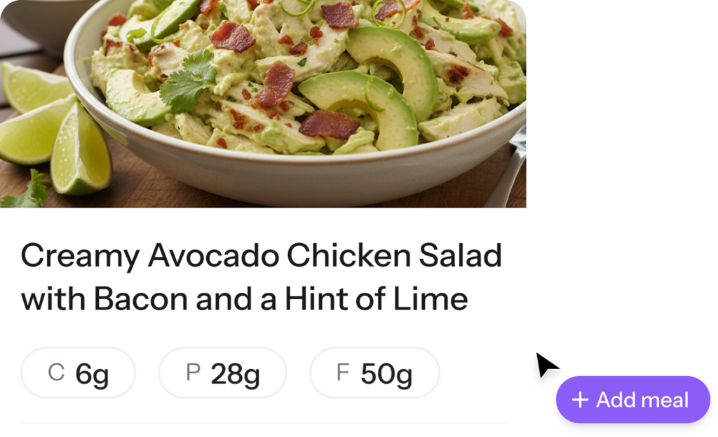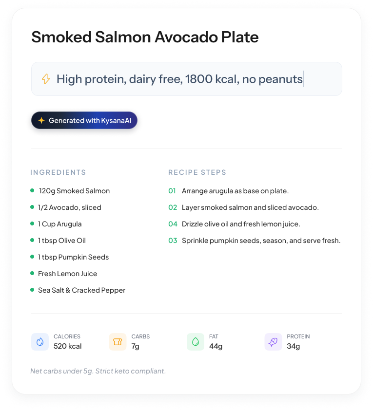Design fully custom meals tailored to each patient’s needs. Enter ingredients, allergies, dietary restrictions, or macro targets. Kysana’s AI generates a complete meal plan with ingredients, recipe instructions, and a full macro breakdown.